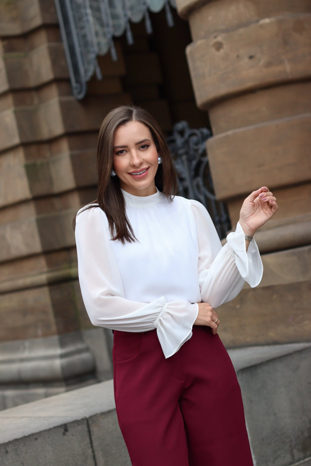 A bata Mirela é a escolha ideal para quem busca elegância e sofisticação no dia a dia. Confeccionada em chiffon leve, com forro em viscose, garante conforto e caimento impecável. Com gola alta franzida, fechamento delicado com botão perolado e mangas com elástico, essa blusa une charme e praticidade. Disponível nas cores bordô, preto e off, é uma peça versátil que transita facilmente do trabalho a eventos especiais. Envio em até 3 dias após a confirmação do pagamento.