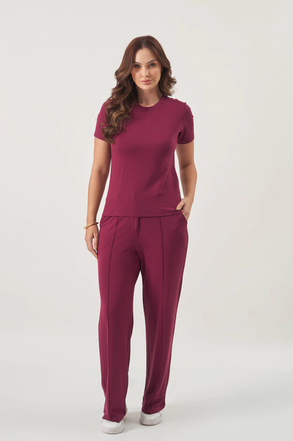 A Calça Moletinho Yasmin é a escolha perfeita para quem busca conforto e estilo. Sua modelagem pantalona proporciona um caimento fluido, enquanto o friso frontal dá um toque de sofisticação. O elástico na parte traseira oferece maior conforto, e o fechamento com zíper e botão garante praticidade e um visual elegante. Disponível nas cores bordô, azul petróleo e marrom, esta calça é ideal para compor looks modernos e versáteis, adaptando-se a diferentes estilos com facilidade.
