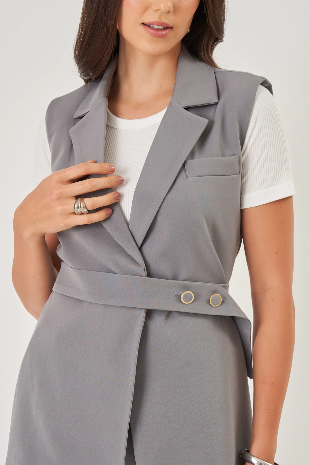 O Colete Elizabeth é uma peça sofisticada e cheia de estilo, que vai transformar seu look com elegância. Disponível nas cores vinho, azul marinho, preto, bege e cinza, é confeccionado em crepe de alfaiataria, com forro de cetim com elastano para um toque de conforto e acabamento impecável. Sua modelagem alongada e a presença de ombreiras conferem um corte estruturado, enquanto os detalhes da faixa e dos botões internos garantem uma silhueta ajustada e moderna. Com bolso funcional e sem fechamento externo, ele é perfeito para criar looks sofisticados e dinâmicos, seja no trabalho ou em ocasiões especiais.