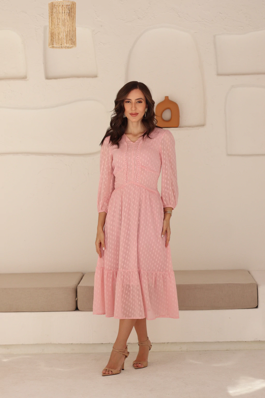 O Vestido Ayla une elegância e leveza em um design atemporal. Confeccionado em chiffon texturizado, possui comprimento midi, mangas longas com punho ajustado e caimento delicado. O lastex nas costas garante conforto ao vestir, enquanto o detalhe frontal traz charme extra à peça. Versátil e sofisticado, é perfeito para compor produções elegantes em diferentes ocasiões.